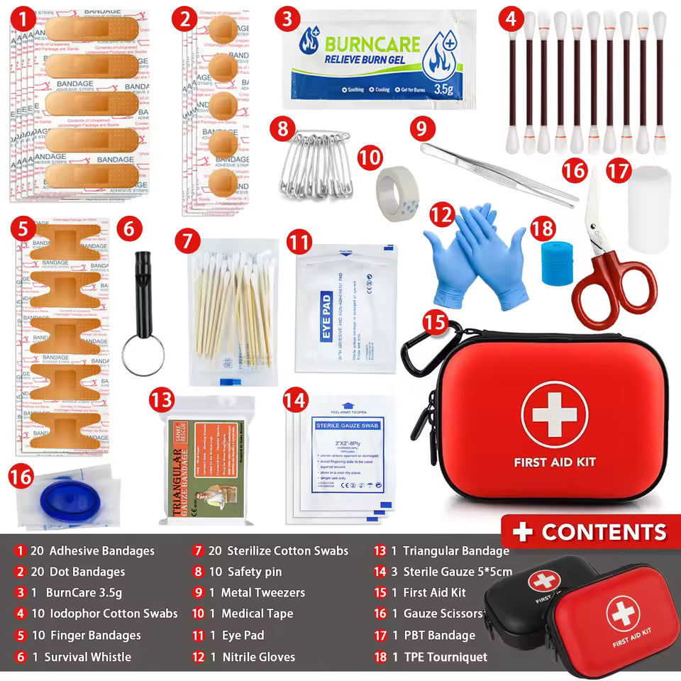 ✅ Kompletny zestaw 18 elementów – plastry, bandaże, kompresy, opaski uciskowe, rękawiczki, nożyczki i wiele innych.